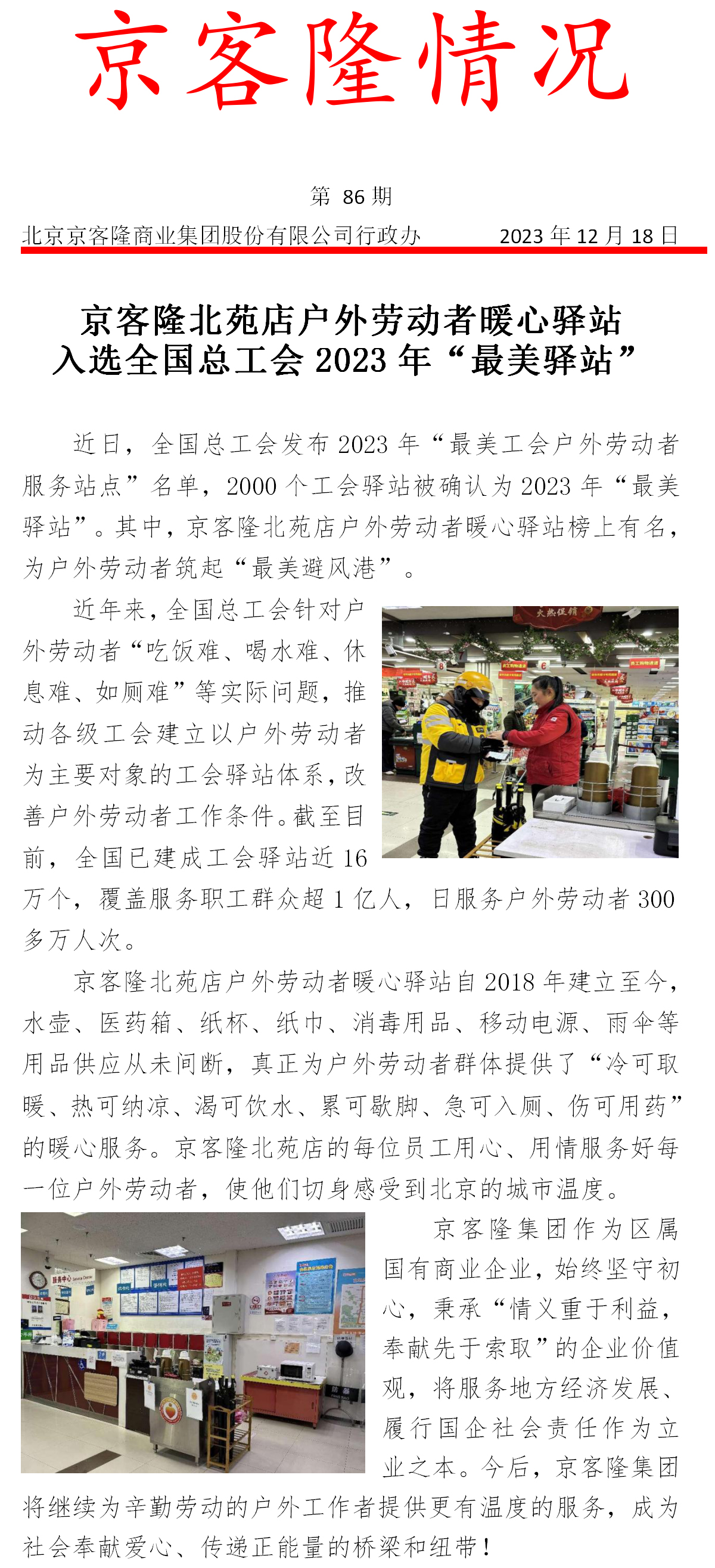 京客隆北苑店户外劳动者暖心驿站 入选全国总工会2023年“最美驿站”